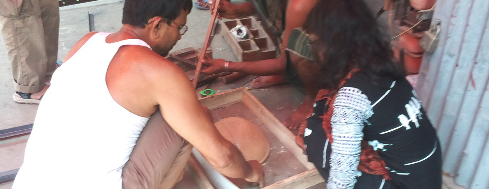 The measurement of the space allocated for the basin in the toilet was particular. A dice was made with caution accordingly. It was given the desired shape with scrap plywood. A reinforcement had to be made for the basin to hold up its shape. for the shape of the bowl, an earthen cow feeder bowl was used. The Sand-Cement mixture was poured in the dice and the reinforcement was placed inside.